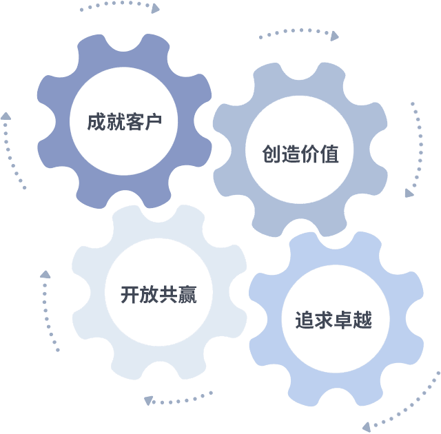 成就客户是一切决策的出发点,,创造价值是衡量所有工作的标准,,追求卓越是我们做事做人的态度,,,,开放共赢是我们的格局也是最终的结果。。价值观的齿轮环环相扣,,,推动着组织里的每个人不断向前。。