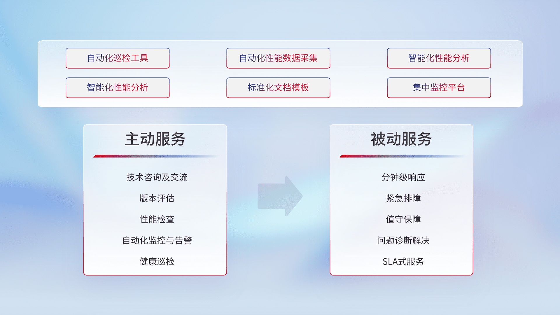 智能化工具和标准化文档,,,,保障服务质量,,,,提供主动服务(包含技术咨询、、版本评估、、、性能检查、、、自动化监控与告警、、、、健康巡检)和被动服务包含(分钟级响应、、、、紧急排障、、、值守保障、、问题诊断解决、、、、SLA服务)。。。